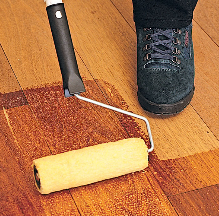 När golvet är helt rent och torrt, rollas träoljan på med en vanlig färgroller på ett långt skaft. Arbeta baklänges ut mot en dörr, så att du inte behöver gå på den oljade ytan.
