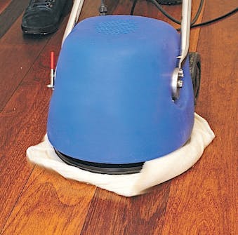 När oljan har “satt sig” efter ca 15 minuter, poleras överflödig olja bort. Det kan göras med en ren golvtrasa och en kvast/golvborste. Polera noggrant, så att alla blanka fläckar försvinner.