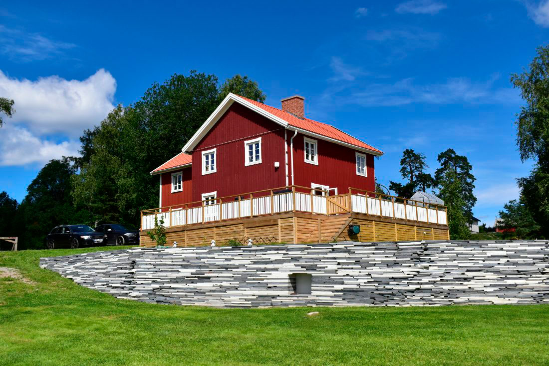 Den här stenmuren kan utan tvekan kallas unik. Daniel har byggt hela muren av gamla, kasserade stenbänkskivor i olika färger och nyanser, vilket ger trädgården ett mycket speciellt utseende. Vi tycker att det är ett roligt sätt att återanvända annars oanvändbara bänkskivor.