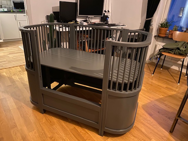 Emils barnsäng är ett hantverk av högsta klass. Den är både genomtänkt och snyggt gjord. Det finns många vackra detaljer - från mässingslister till det faktum att botten kan höjas och sänkas efter behov.
