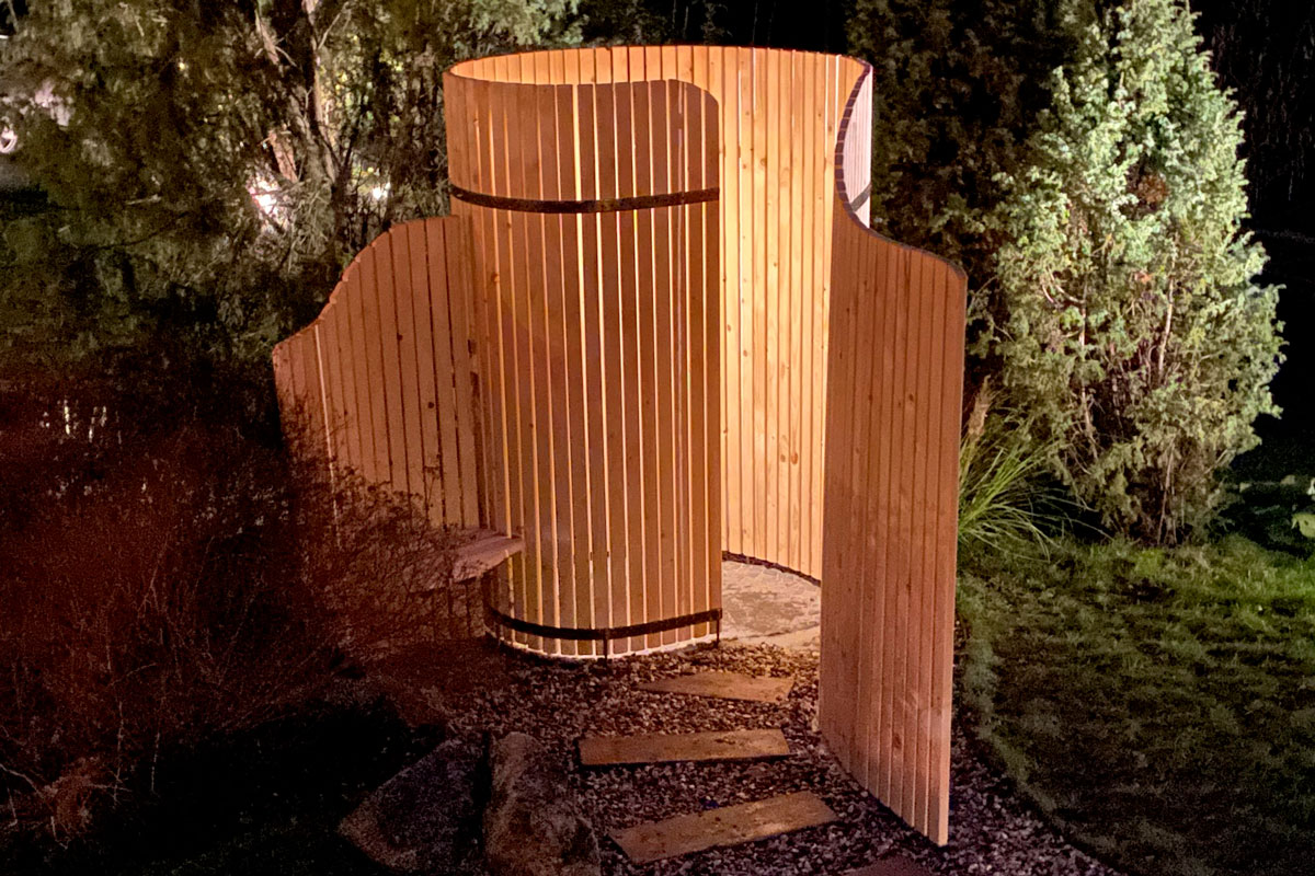 Vi kunde inte motstå den charmiga utomhusduschen som Örjan har byggt. Uteduschen är tillverkad av träribbor som hålls samman av beslag av cortenstål, och har både varmt och kallt vatten.
