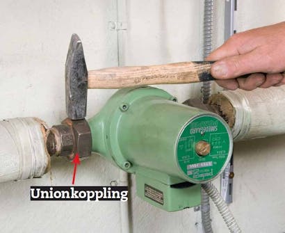 Montera ner den gamla pumpen. Innan du försöker lossa pumpen bör du ge unionkopplingarna ett lätt slag med en hammare. De kan sitta fast hårt och slaget gör dem lättare att skruva av.