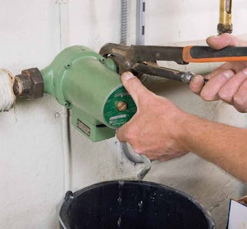 Skruva av unionkopplingarna. Använd rörtång eller skiftnyckel och sätt en hink under pumpen, så att de sista vattenresterna kan samlas upp.