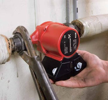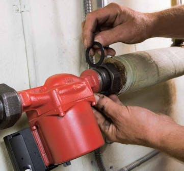 Montera först den nya pumpen på ena sidan. Kolla vattenriktningen och montera pumpen lite löst. Var noga med att sätta den gummipackning som följer med mellan unionkoppling och pump.