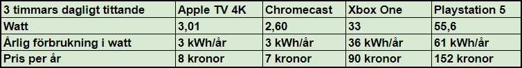 Ett betydligt billigare alternativ till spelkonsolerna är Apple TV och Chromecast. Apple TV drar bara 3,01 watt när du streamar film och serier. Gör du det 3 timmar om dagen blir elförbrukningen 3 kWh om året, till en kostnad av knappt 8 kr om året. En Chromecast drar ännu mindre, 2,6 watt, vilket motsvarar ca 7 kr om året, och det är alltså den billigaste lösningen.