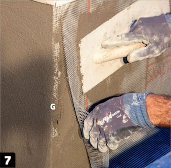 Förstärk hörnen med en hörnprofil (G) med armeringsnät på båda sidor. Hörnprofilen kapas till rätt längd och trycks in i ett tunt lager murbruk innan den täcks med murbruk och ytterligare ett lager nät.