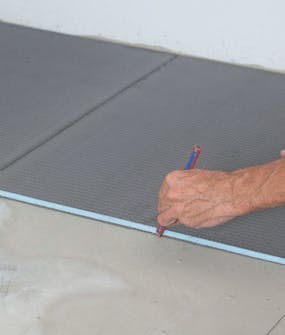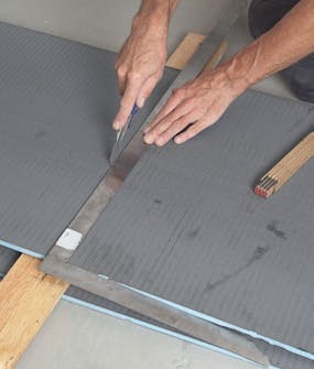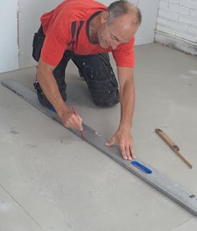 Markera för skivorna när du har mätt rummet och räknat ut hur skivorna ska ligga. Alla skarvar ska förskjutas minst 30 cm. Dra upp strecken en bit på väggarna så syns de om fästmassan döljer dem.