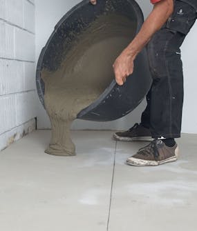 Fördela fästmassa där den första skivan ska ligga. Häll ut en portion ordentligt blandad massa på golvet och fördela den med 6-8 mm tandspackel så att baksidan på hela skivan täcks.