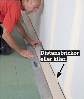 Den första raden rättas till tills framkanten är absolut rak. Mellan brädorna och väggen sätts kilar för att skapa 8-10 mm avstånd. Sätt en kil på var 60:e cm och på bägge sidorna av en skarv.