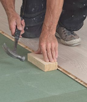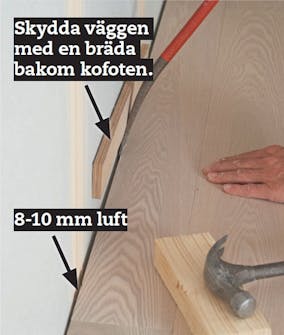 Det blir ofta nödvändigt att slå fast en rad eller enstaka brädor. Använd alltid slagkloss och slå försiktigt. Det är viktigt att den första raden har kilats hela vägen mot väggen och ligger stadigt.