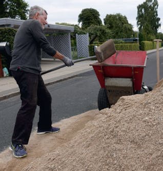 Gruset läggs här ut i ett cirka 10 cm tjockt lager, som packas, varefter det om det behövs kan fyllas på mer.