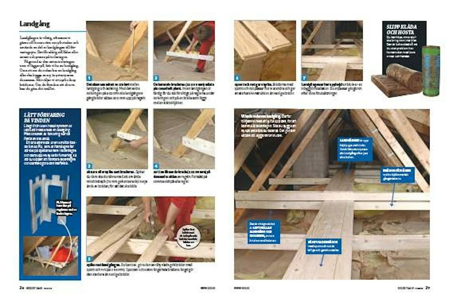 Det får aldrig stå lådor eller annat och pressa på isoleringen. På grund av den extra isoleringen som vi lägger på, bör vi ha en landgång. Oavsett om du redan har en landgång eller ska bygga en ny, är principerna desamma. Här väljer vi att spika ihop brädorna. Om du föredrar att skruva kan du göra det istället.