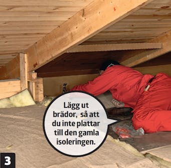 Lägg båda lager på en gång, om du som här ligger flera lager. Då undviker du att trampa på det första lagret av isolering för att kunna lägga det andra lagret.