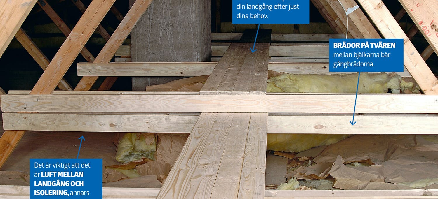 Det ska vara minst 10 cm luft mellan landgång och isolering. Med den extra isoleringen på 200 mm ska landgångens gångbrädor sättas 300 mm upp på regeln.