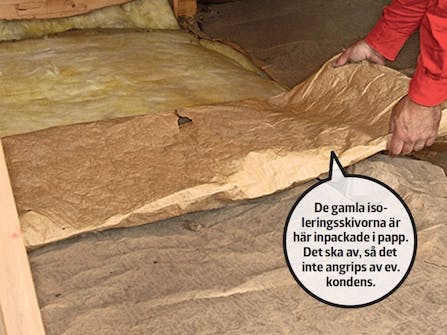 Riv upp isoleringen. Förstörda och platta skivor kasseras. Här är den gamla isoleringen fin. Den ska bara rättas till lite, och pappen ska tas av.