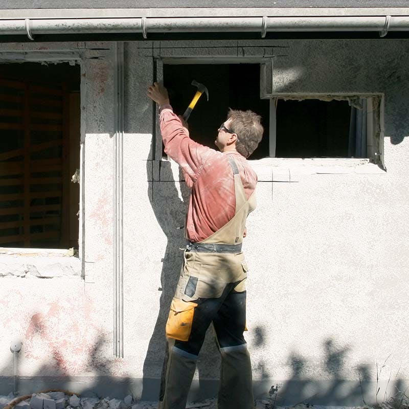 Nya fönsteröppningar och urtag i de gamla sågas upp. Först sågas så djupt som möjligt med diamantsågklinga monterad i cirkelsåg. Resten klarar vi med tigersåg och långt blad.