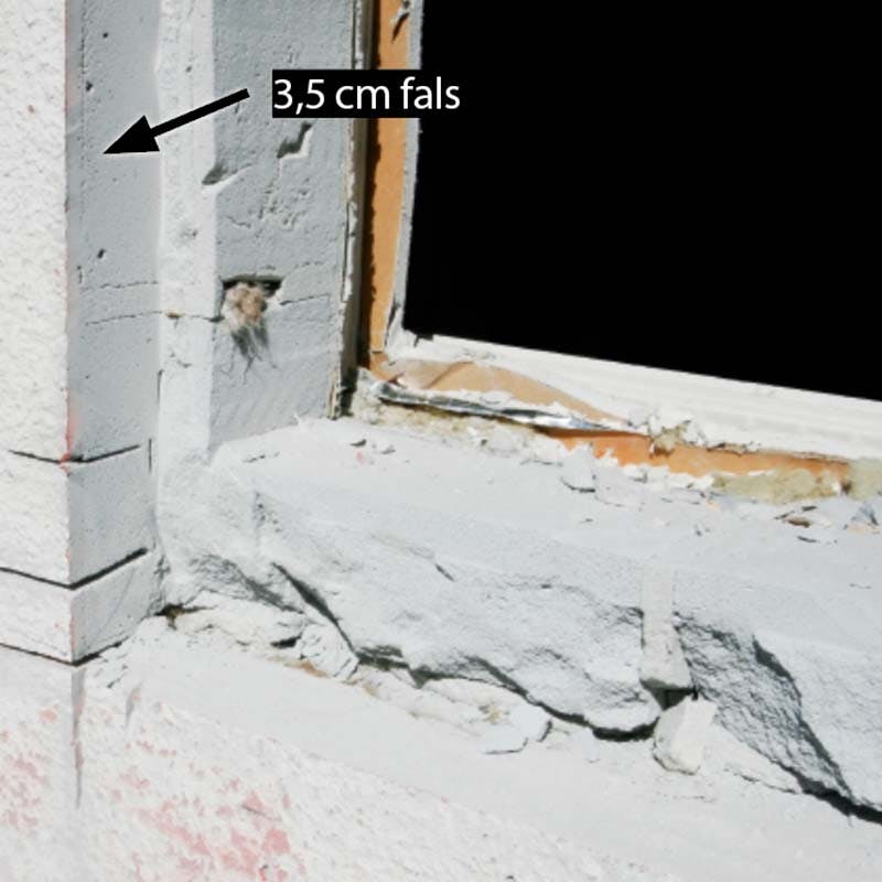 I ovankant och på sidorna av fönster och dörrar sågas ytterligare ett spår 3,5 cm från öppningen så att vi kan fodra öppningen med 30 mm isolering. Ett annat alternativ är att flytta ut fönstren så att karmen hamnar vid isoleringen.