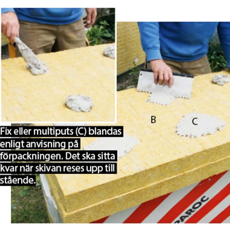 Isoleringen (B) skärs till och förses med fix eller multiputs (C) på baksidan. Om väggen är slät drar du ut fixet med tandspackel annars lägger du sex-åtta tjocka klickar på skivan.