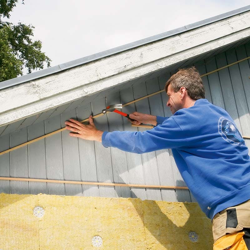 Oavsett vilken fasad din villa har i dag, så kan du sätta upp en utvändig tilläggsisolering och avsluta med puts. Både putsen och mineralullen är diffusionsöppna. Det är naturligtvis skillnad på förberedelserna och uppsättning av isoleringen. En fasadpanel ska tas ner, rensas och kan sättas upp efteråt - eller du kan låta bli. Här är ytterväggarna av lättbetong och det är ett tacksamt material att bearbeta och skruva i.