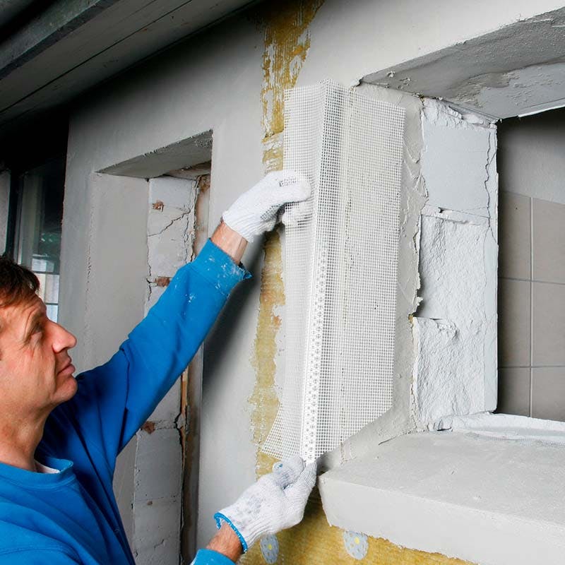 Falsen på varje sida om och ovanför fönstret stryks också med grundputs och förses sedan med hörnprofiler. Du ska inte bli förvånad, om det är besvärligt att fästa profilen upptill. Lägg på rikligt med bruk och prova igen.