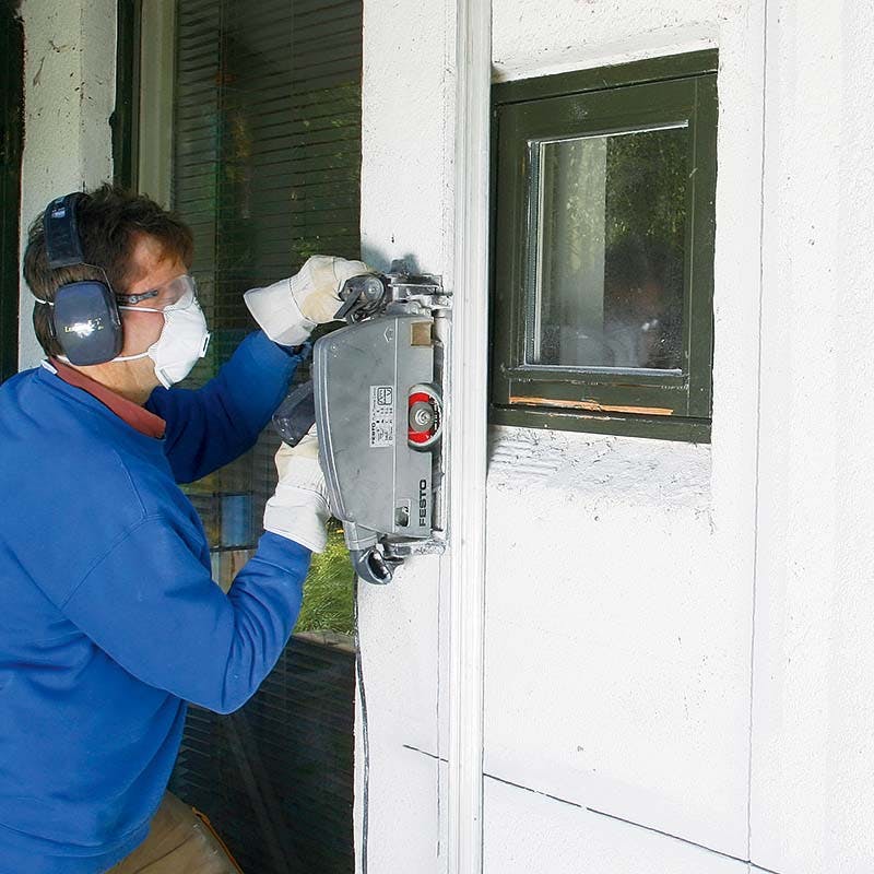 Isoleringen klarar upp till 10 mm ojämnheter, men arbetet går snabbare och kräver mindre fix om väggen är slät. Vi bearbetar därför den gamla ytputsen med slipmaskin, och sedan görs urtag i fönsteröppningarna för isolering.