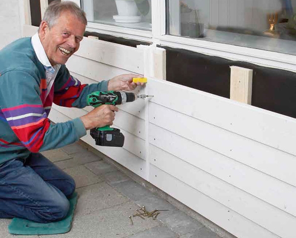 Fäst fasadpanelen på brädorna med 4,5 x 60 mm skruvar. Börja nerifrån och se till att den undre brädan sitter kant i kant med de lodräta sidobrädorna. Håll 5 mm avstånd till sidobrädorna med exempelvis små plastbrickor.