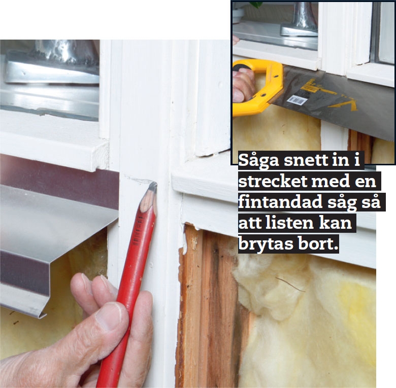 Håll fönsterblecken mot de undre glasningslisterna men se till att en ev. luftspalt inte täpps igen. Markera sedan ovankanten på blecken med ett streck.