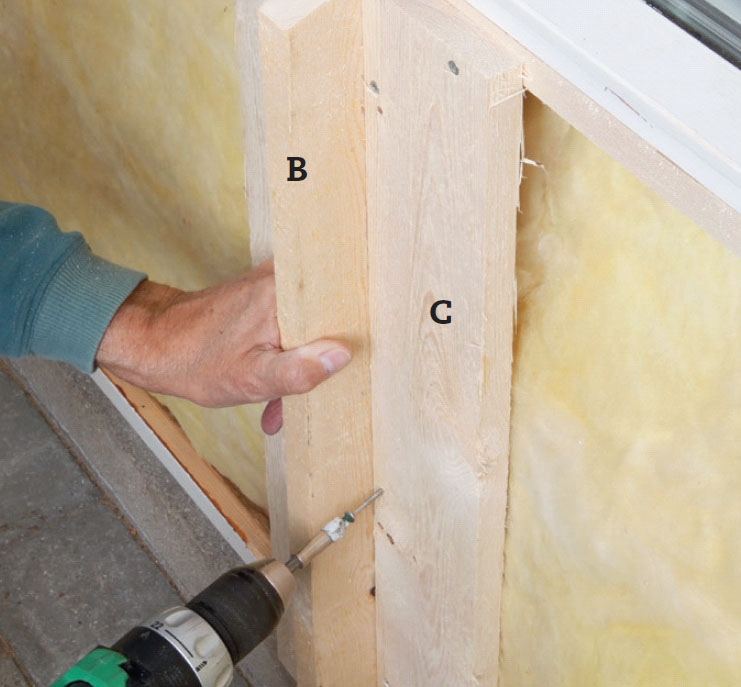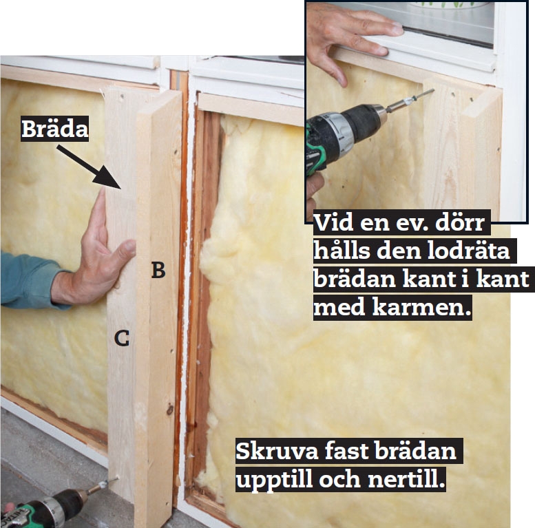 Håll en lodrät bräda B rakt nedanför en fönsterkarms sida och fäst den i den lodräta brädan C, som har monterats på de vågräta listerna.