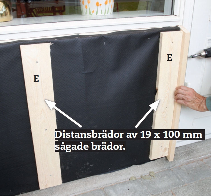 Skruva fast en 19 x 50 mm list A under karmen. Listen sågar du till genom att klyva en 19 x 100 mm list. Den ska användas till att fästa brädorna C. Fäst listerna med 4 x 40 mm skruvar.
