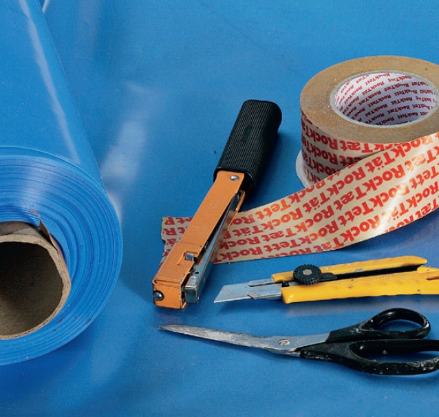 Folien fästs med klammer och över varje klammer fäster du en tejpremsa.