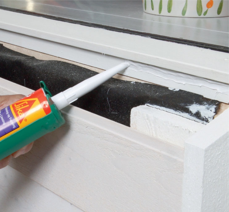 Lägg på en fästmassa där blecket ska sitta. Tätning mellan fönsterkarmen ovanför och blecket kan utföras med en tätningsmassa eller fogmassa. Lägg en sträng under glasningslisten, men täpp inte igen ev. luftspalter.
