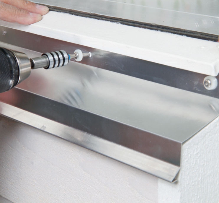 Tryck fast blecket i fogmassan och skruva sedan fast det. Om blecket inte har hål för skruvar, borrar du 4 mm hål och skruvar sedan fast blecket med 4 x 20 mm skruvar med plastbrickor (bleckskruvar).