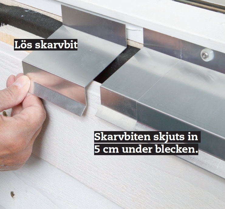 Eftersom tilläggsisoleringen kräver mer plats än väggens tjocklek, så ökas alltså tjockleken. För att få en snygg avslutning upptill täcks den nya panelen med fönsterbleck. Sådana säljs i flera utföranden och med olika djup, så du kan välja ett bleck som passar din ”påbyggnad”. Här byggs fasaden ut så mycket att vi kan isolera med 70 mm mineralull.