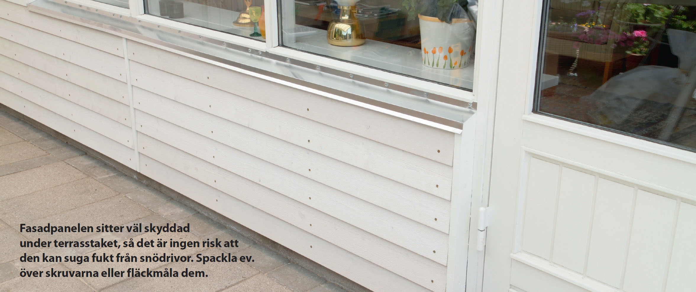 För att det ska se snyggt ut använder vi 25 x 100 mm brädor B som sidor i de fält som vi bygger ut fasaden med. Brädorna sågas upptill i samma vinkel som fönsterblecket. Det kan ev. bli nödvändigt att hyvla eller såga brädorna lite smalare. Det ser du vid en provmontering.
