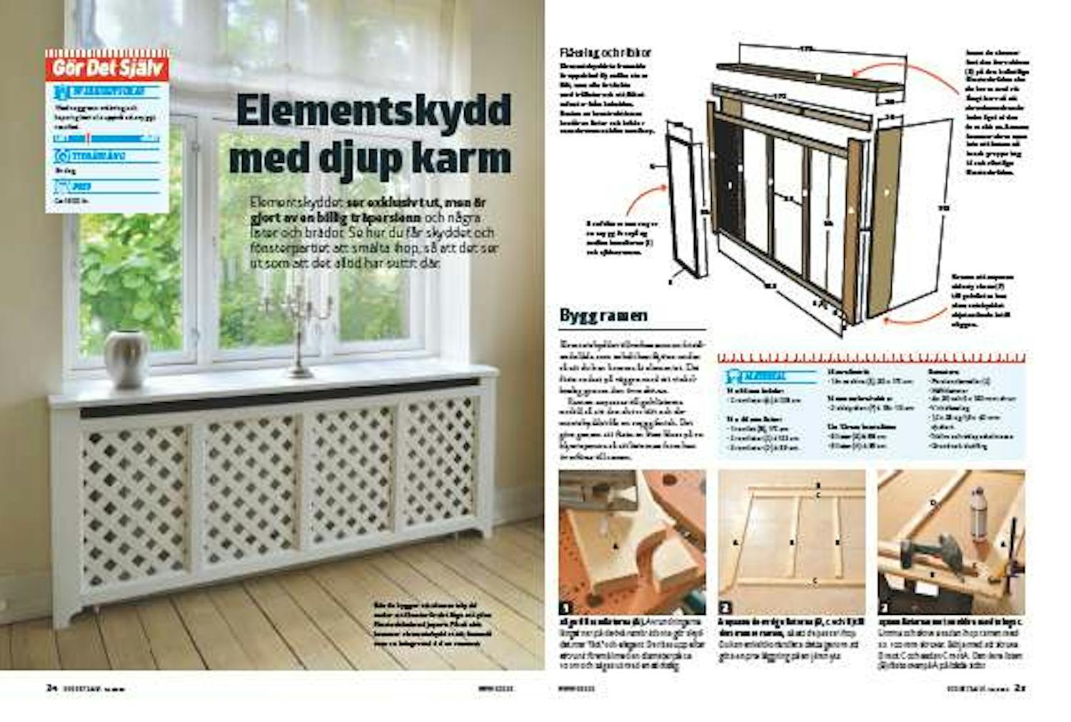 Elementskyddet tillverkas som en fristående stomme som enkelt kan flyttas undan så att du kan komma åt elementet. Det fästs enkelt på väggen med ett vinkelbeslag genom den övre skivan.
