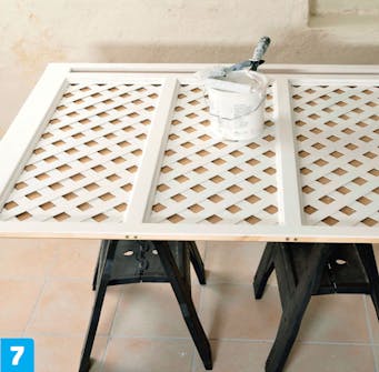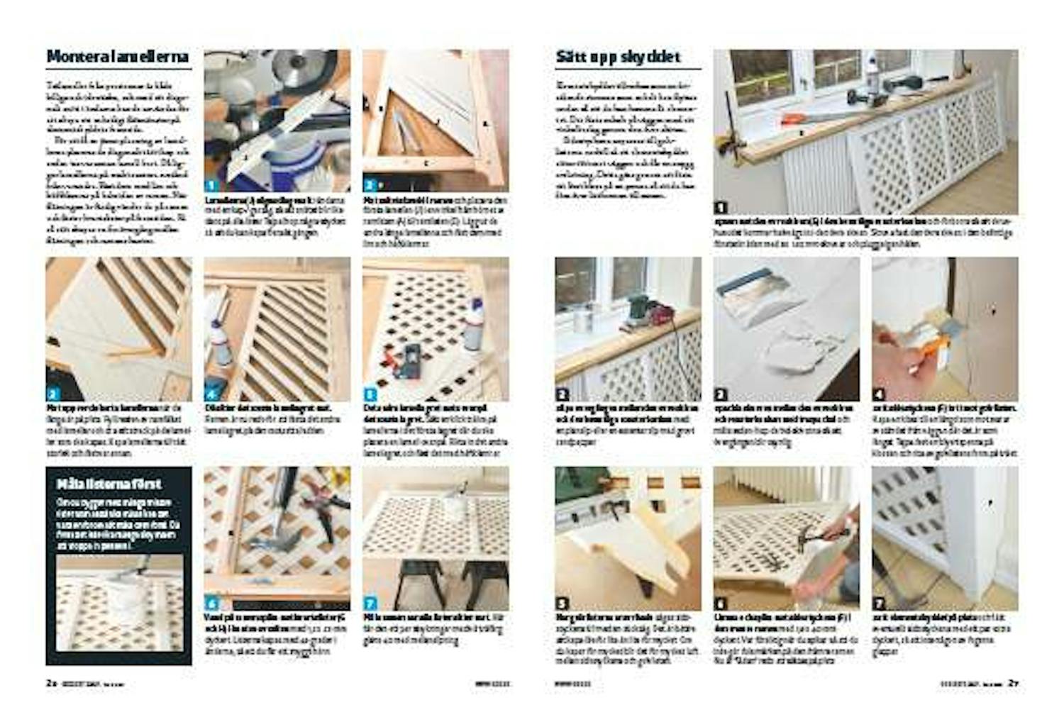 För att få en jämn placering av lamellerna placeras de diagonalt tätt ihop och sedan tas varannan lamell bort. Då ligger lamellerna på exakt samma avstånd från varandra. Fäst dem med lim och häftklamrar på baksidan av ramen. När flätningen är färdig vänder du på ramen och fäster kvartslister på framsidan. På så sätt skapas en fin övergång mellan flätningen och ramens kanter.