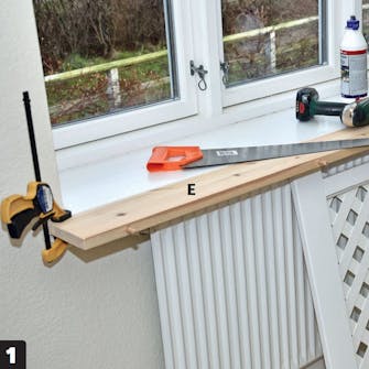 Spänn fast den övre skivan (E) i den befintliga fönsterbänken och förborra så att skruvhuvudet kommer halvvägs in i den övre skivan. Skruva fast den övre skivan i den befintliga fönsterbrädan med 5 x 120 mm skruvar och plugga igen hålen.