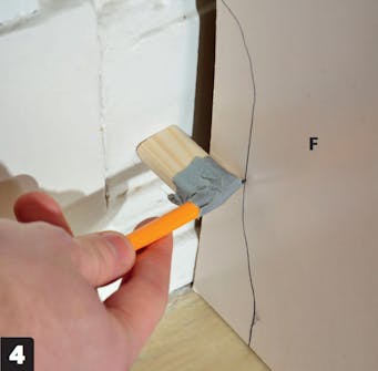 Sätt sidostyckena (F) tätt mot golvlisten. Kapa en kloss till en längd som motsvarar avståndet från väggen där det är som längst. Tejpa fast en blyertspenna på klossen och rita av golvlistens form på träet.