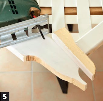 Såga till ramlisterna (A). Avrundningarna längst ner på de två rambrädorna gör skyddet mer “lätt” och elegant. De ritas upp efter ett runt föremål med en diameter på ca 10 cm och sågas ut med en sticksåg.