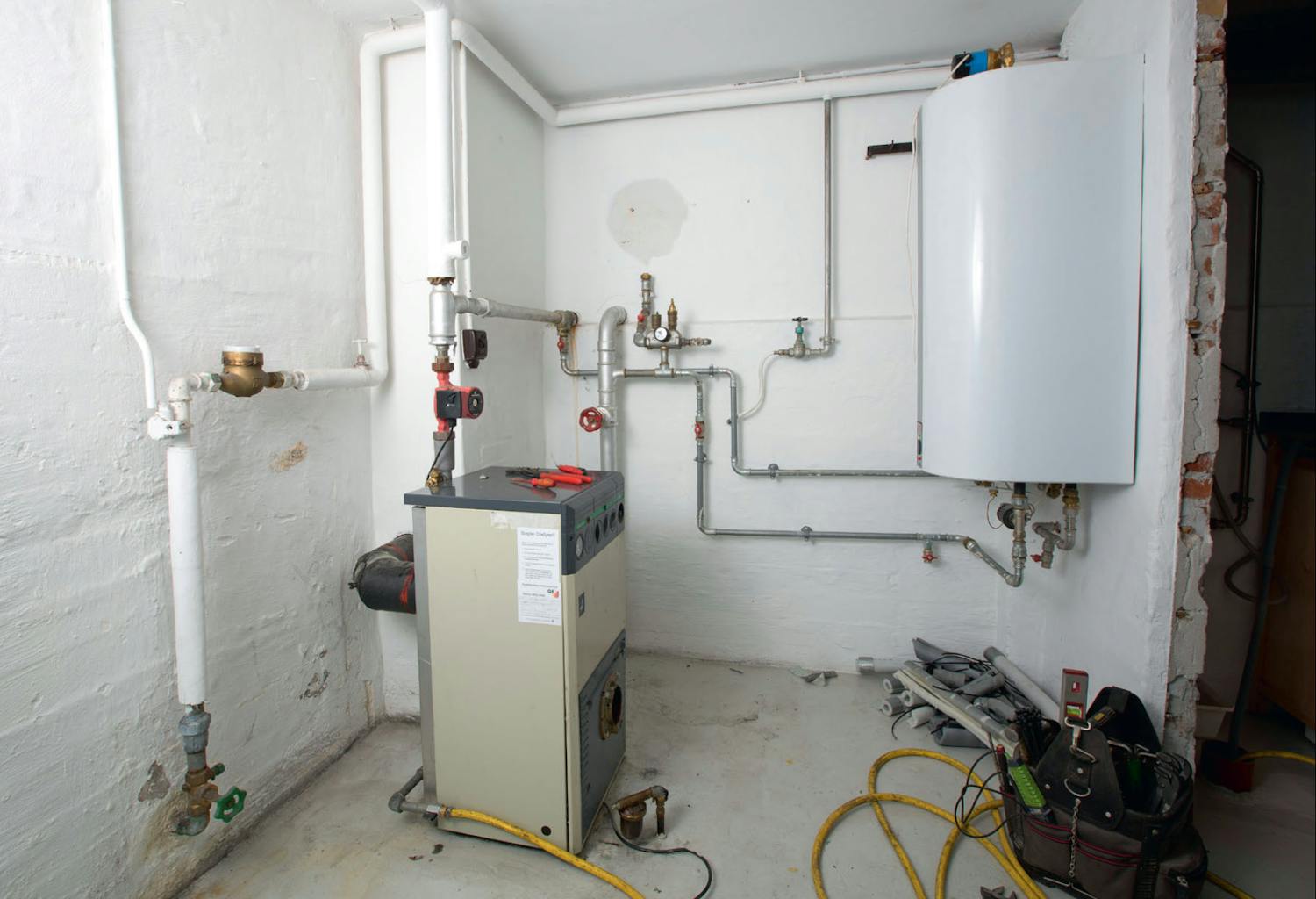 Pannrummet är tomt och den nya varmvattenberedaren bärs in. Det gäller att finna en bra placering av den i närheten av de rör som går till radiatorerna och till tappkranarna. Men det ger sig ofta själv var den ska stå.
