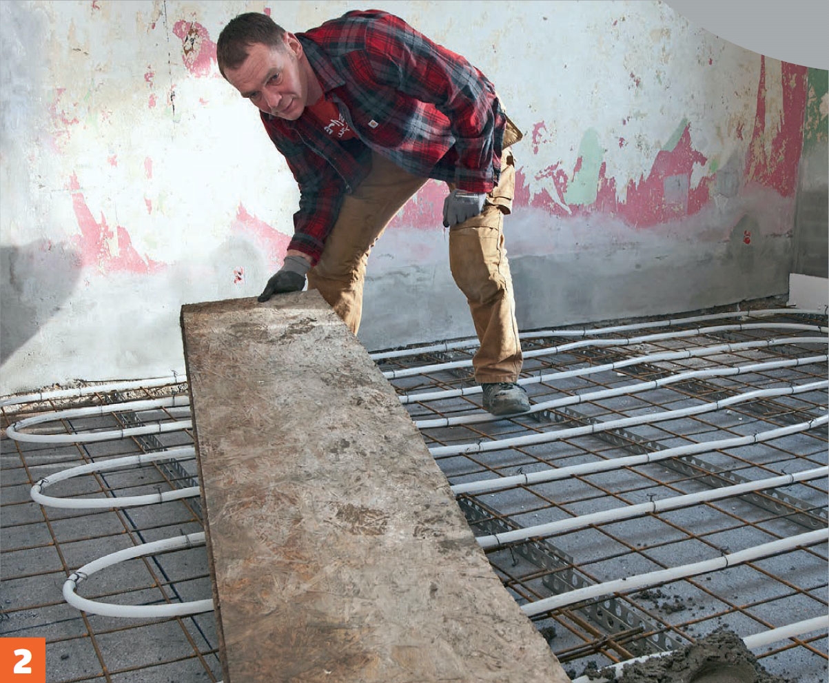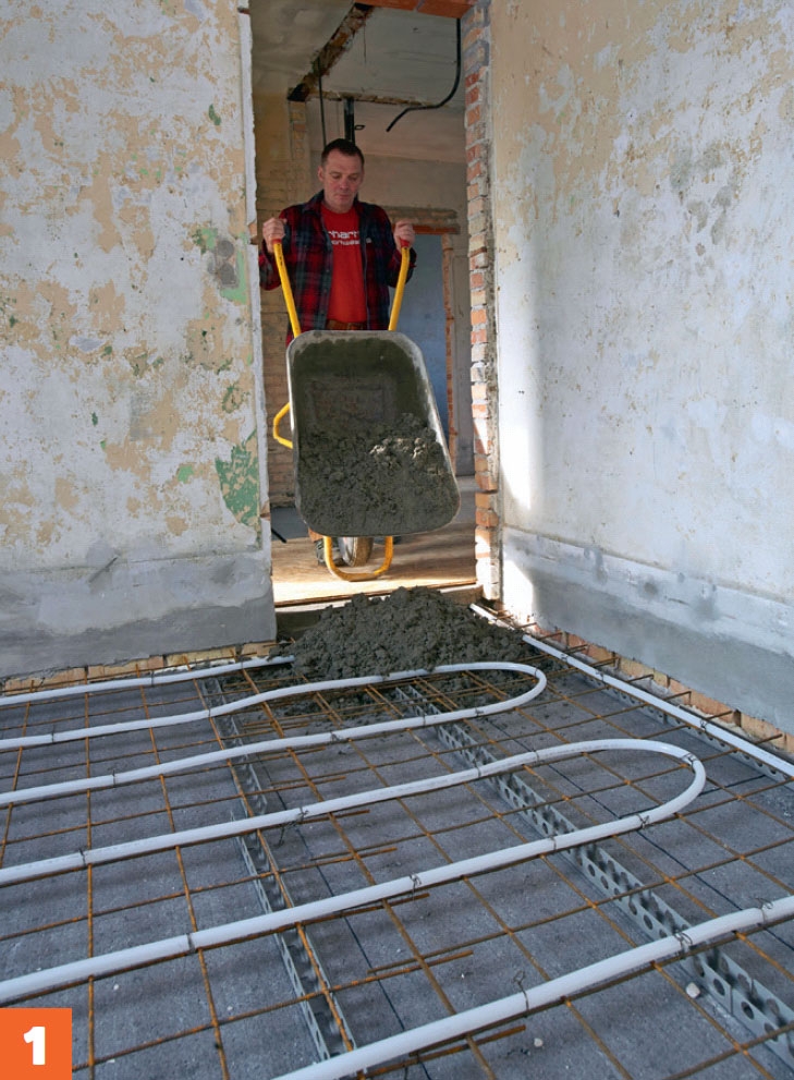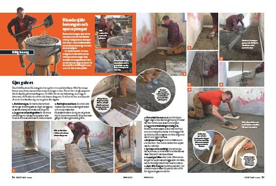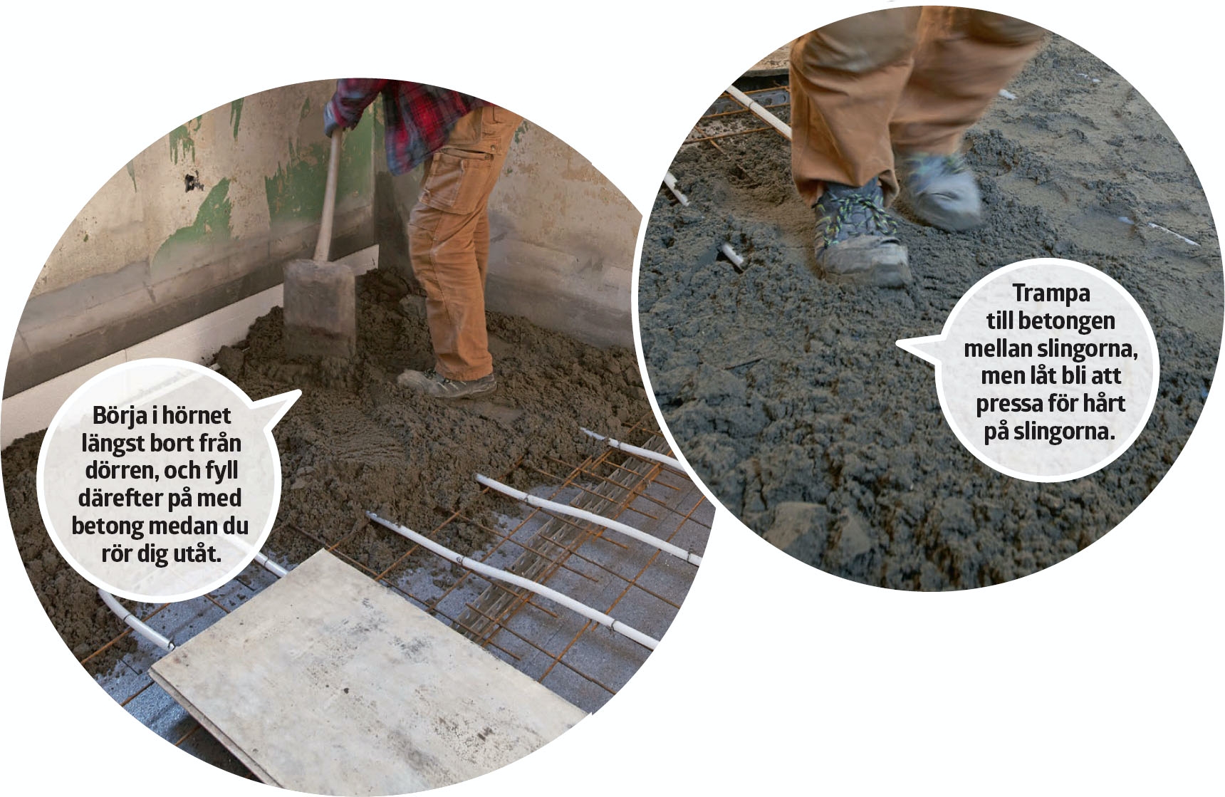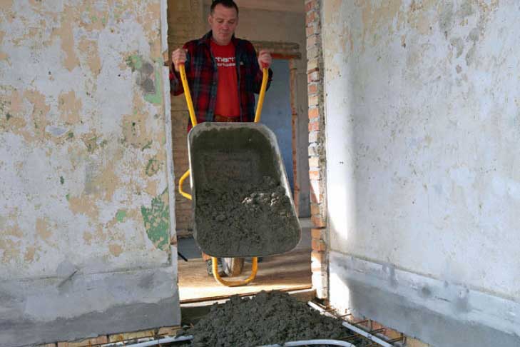 Den förhållandevis lilla mängden betong kör vi in med skottkärra. Med lite tempo hinner man detta utan problem innan betongen torkar. När du kör och går på golvet ska du skydda golvvärmeslingorna. De håller för en viss belastning, men lägg en skiva över, så fördelar du vikten och skonar slingorna. Se till att du har en mätpunkt så att du kan försäkra dig om att golvet blir vågrätt.