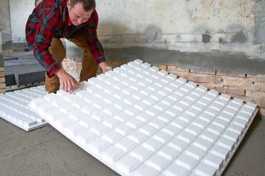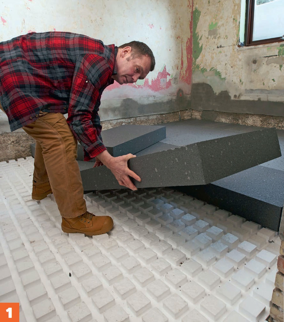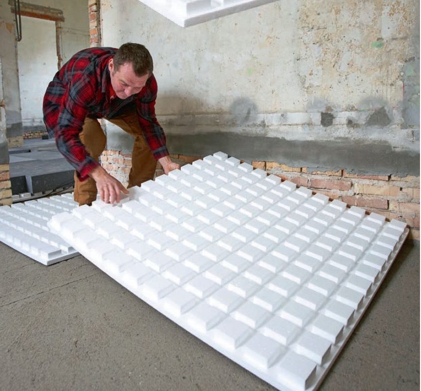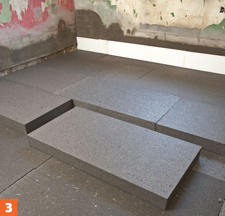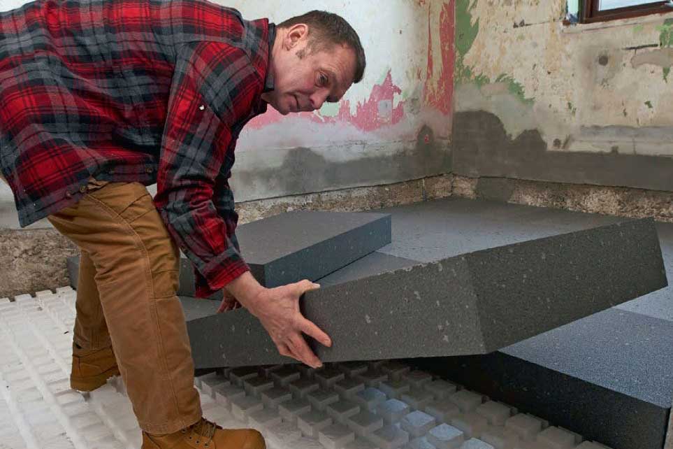 Isolering ska påföras under golvvärmen. Annars försvinner all värmen ned i marken. Tryckfasta polystyrenskivor är en lätt och praktisk lösning. Polystyrenskivorna är normalt vita. När de är grå, som här, beror det på att grafit har tillsatts. Detta ger enligt tillverkaren en förbättrad isoleringsförmåga på inte mindre än 20 procent. Du kan alltså spara en femtedel av isoleringstjockleken eller lägga samma skikt och få 20 procent högre isoleringsförmåga.