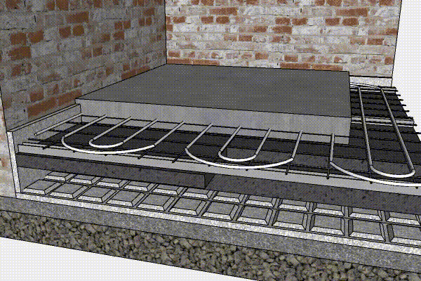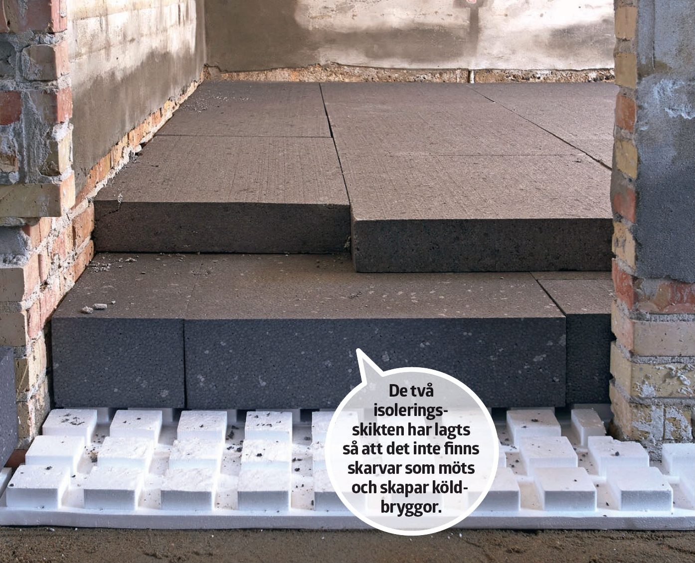 Skydd mot köldbryggor. Upp mot yttermuren ska du säkerställa att betongen som ska läggas på inte får direkt kontakt med muren. Det är effektivt att placera 20 mm flamingoskiva lodrätt ovanpå det första skiktet av polystyrenskivor.