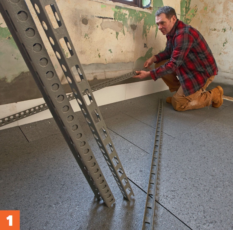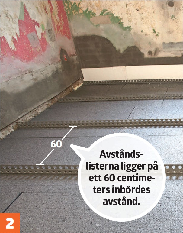 Listerna läggs ut med 60 centimeters mellanrum över hela golvet. Ut mot väggarna håller de ett avstånd på 10 cm. Här längst ut i kanten ska det inte läggas golvvärmeslingor.