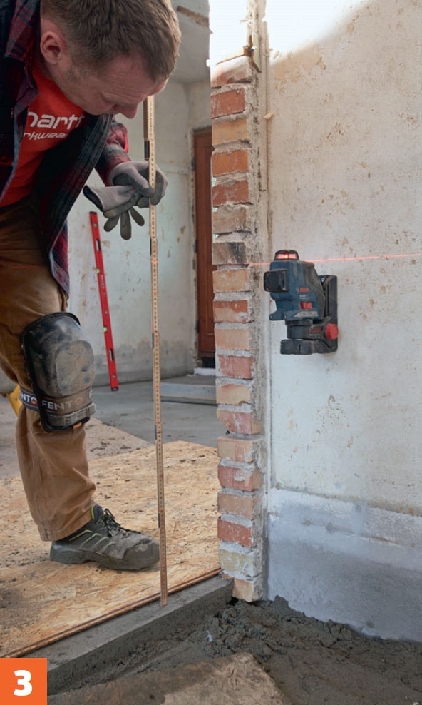 Mät också i hörnen så att du från början lägger någorlunda rätt mängd betong. Vi mäter här från samma laserstreck som tidigare.