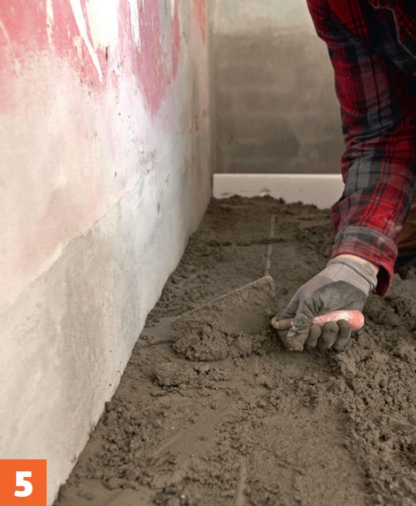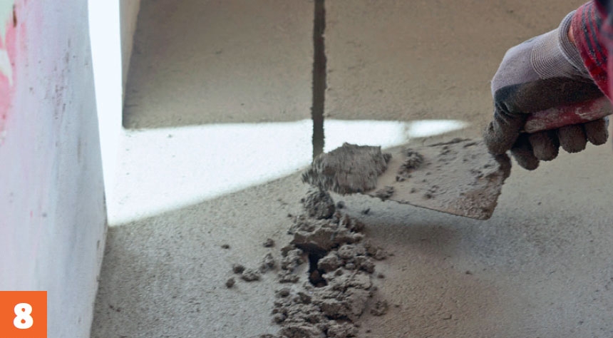 Lappa igen hålen efter rören. Eftersom betongen har avjämnats på bägge sidor om hålet, kan du försiktigt rätta till den med mursleven.