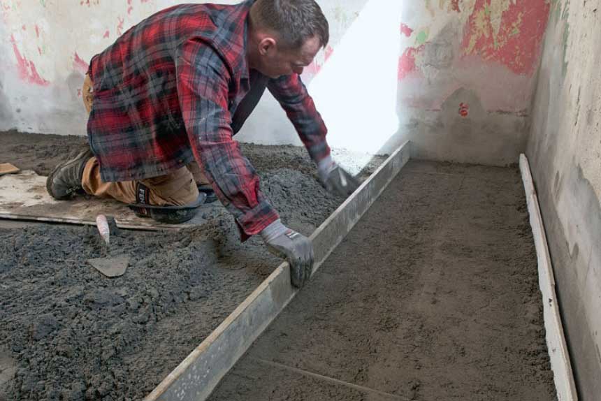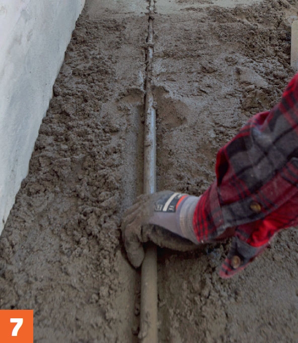 Avjämna betongen med en rätskiva som vilar på rören. Ytan mellan de två rören avjämnas nu i rätt höjd.
