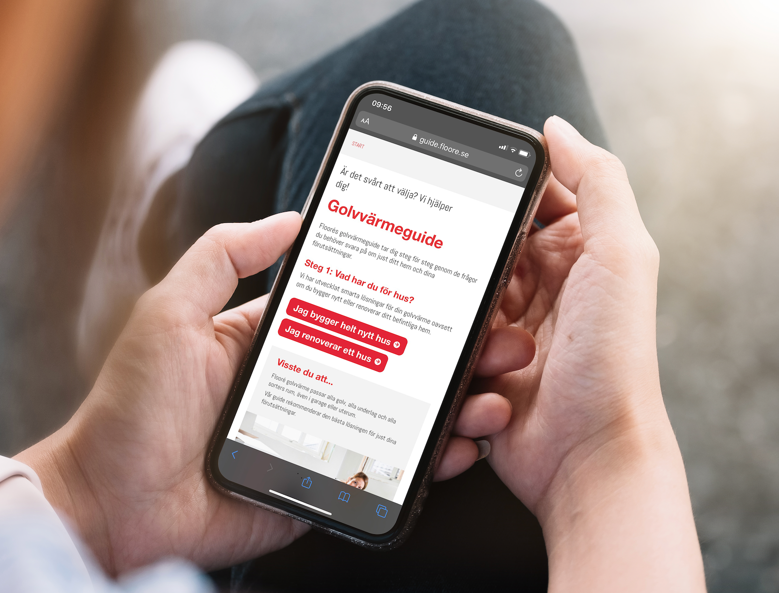 Floorés golvvärmeguide hittar du på floore.se och det enda du behöver göra är att svara på några korta frågor innan du får en inköpslista med förslag på produktpaket för ett komplett golvvärmesystem från din närmaste återförsäljare. När du sedan ska lägga golvvärme följer du installationsanvisningarna via bilder och videoklipp med enkla steg-för-steg-instruktioner.