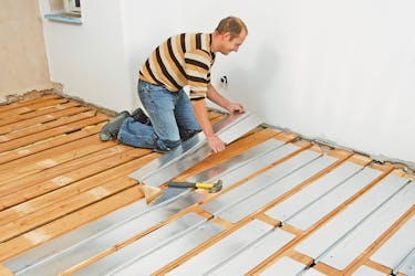 När du har lagt isoleringen, ska de gamla golvbrädorna fästas och det blir med baksidan uppåt. Spåret mellan brädorna ska vara 3 cm och avståndet mellan spåren 30 cm. Då kan värmefördelningsplåtarna lätt fixeras.