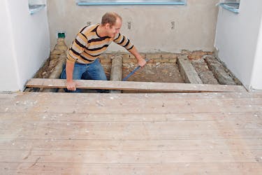 Börja med att ta bort socklarna. Använd kofot, men se upp så att du inte skadar väggen när du bryter. Har du tänkt måla väggarna, så gör det nu - innan du tar bort golvet.